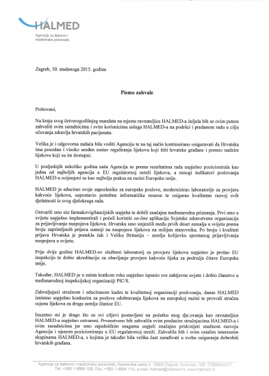 Na kraju svog četverogodišnjeg mandata na mjestu ravnateljice HALMED-a željela bih se ovim putem zahvaliti svim suradnicima i svim korisnicima usluga HALMED-a na podršci i predanom radu u cilju očuvanja zdravlja hrvatskih pacijenata.